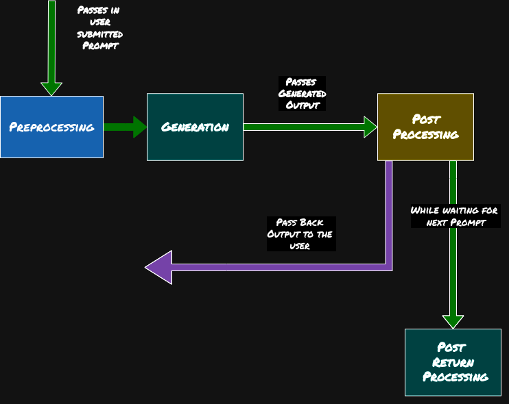 - Post Return Processing: Handles the response while waiting for next prompt, with feedback loop passing output back to user
