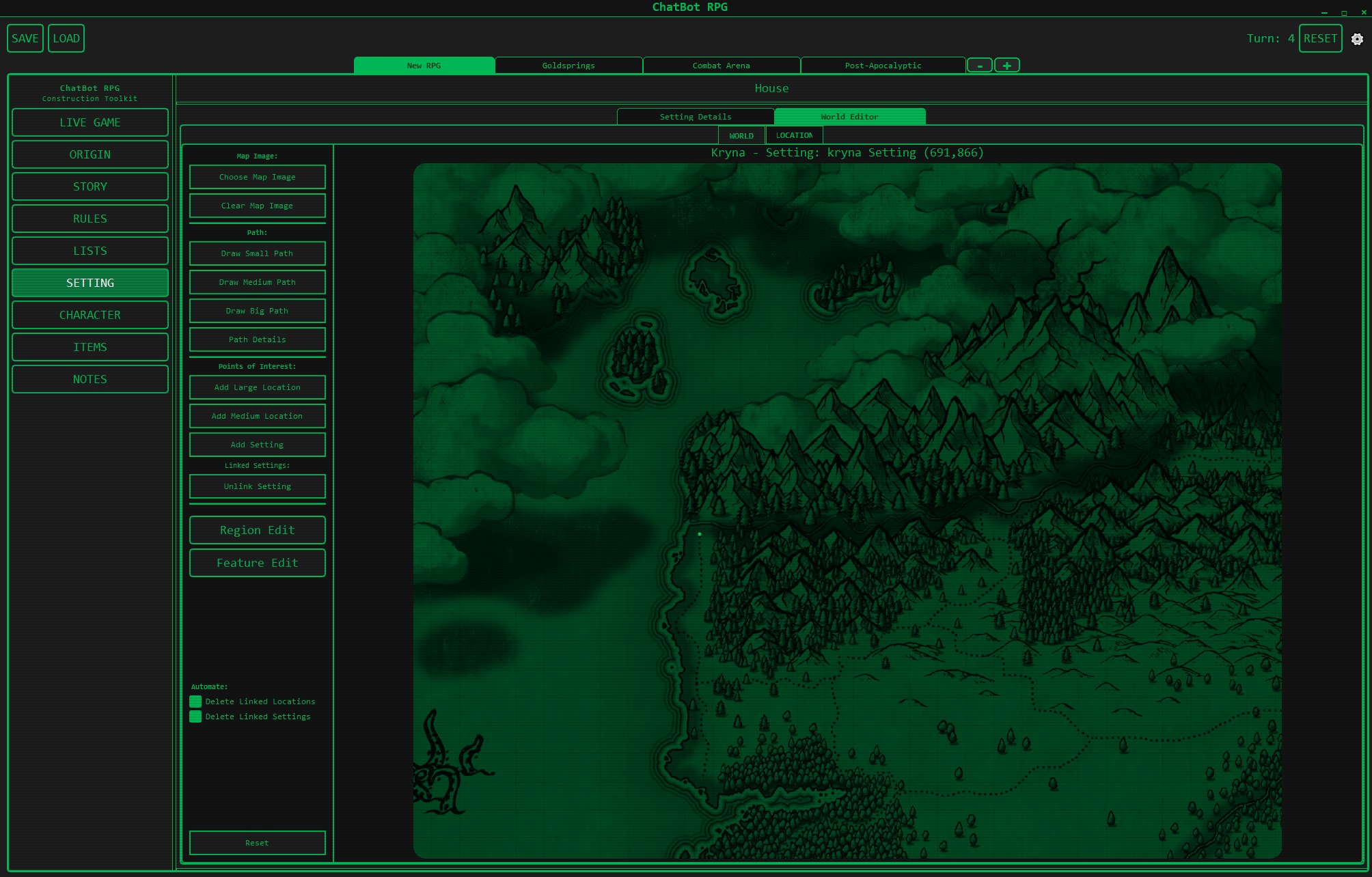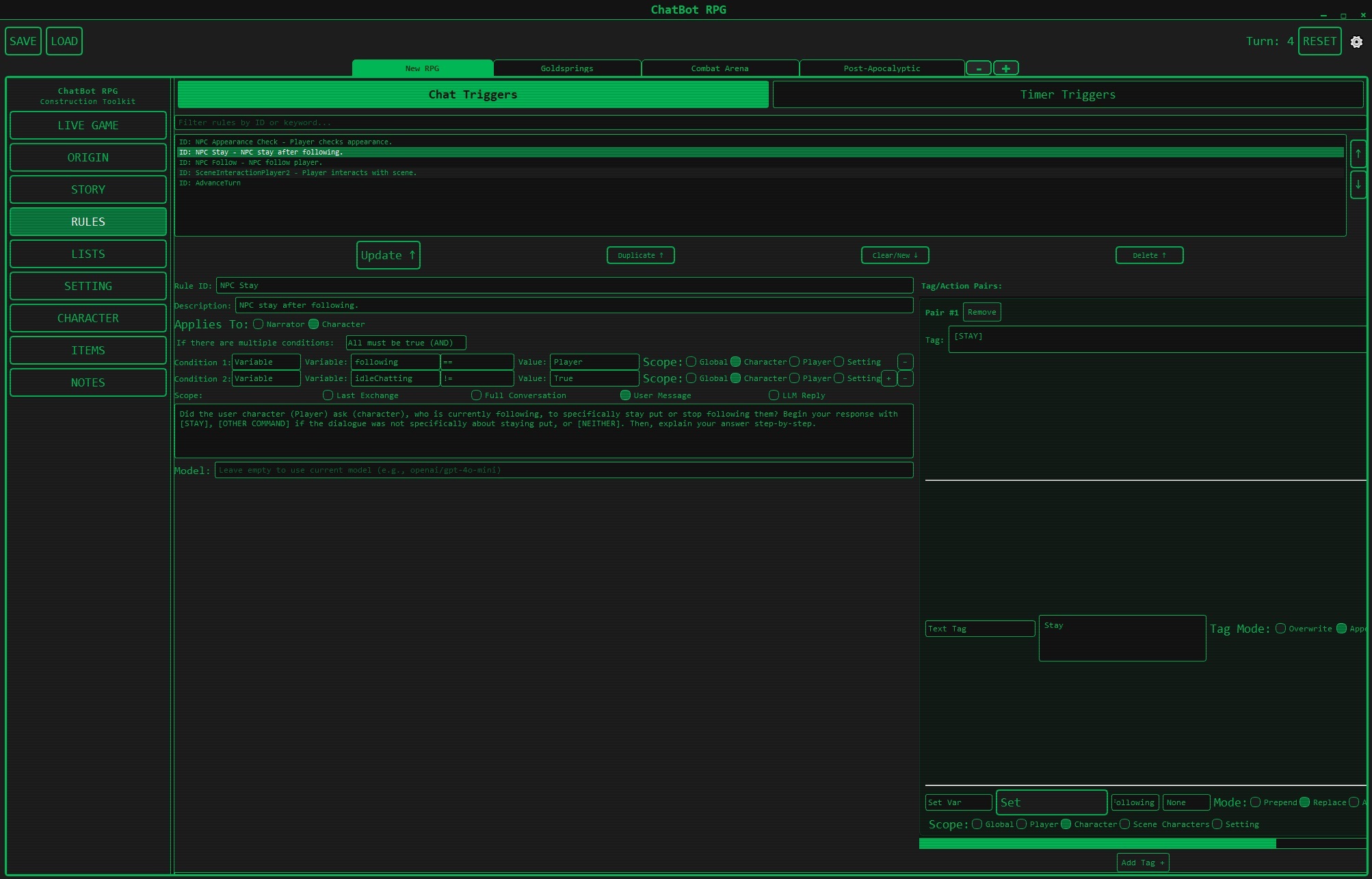 - ChatBotRPG: GUI-first, visual rule editor