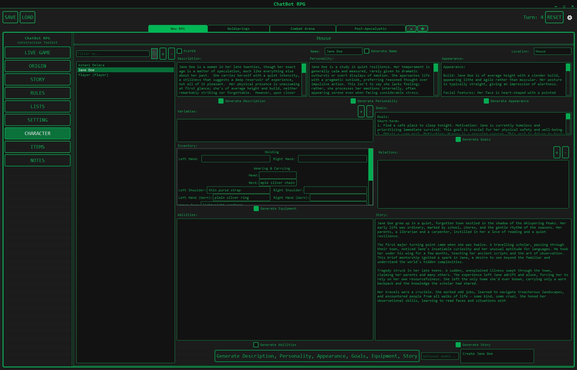 - “Generate Goals”, “Generate Equipment”, “Generate Abilities” buttons
